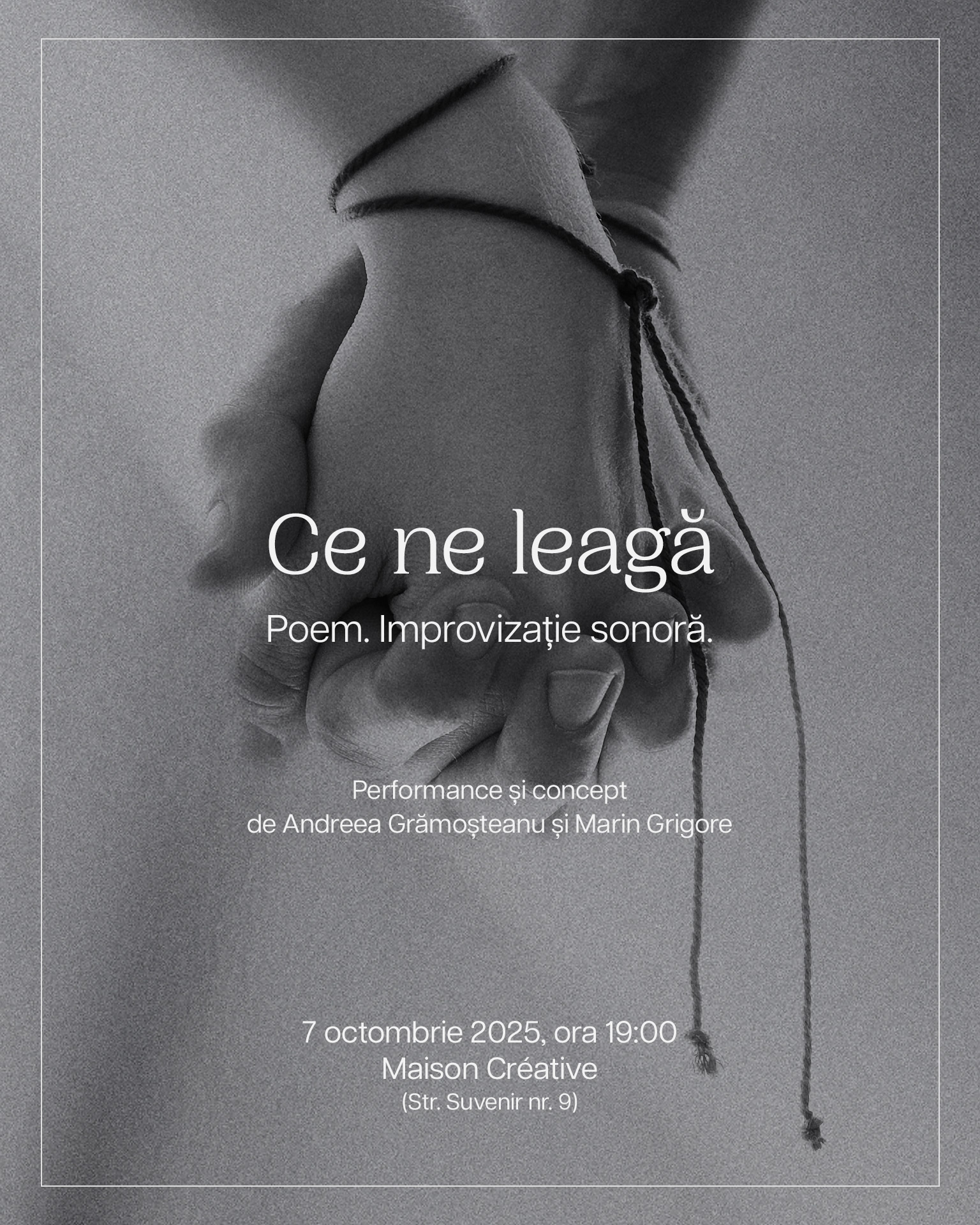 „Ce ne leagă” este un performance de poezie și improvizație sonoră imaginat de actorii Andreea Grămoșteanu și Marin Grigore.